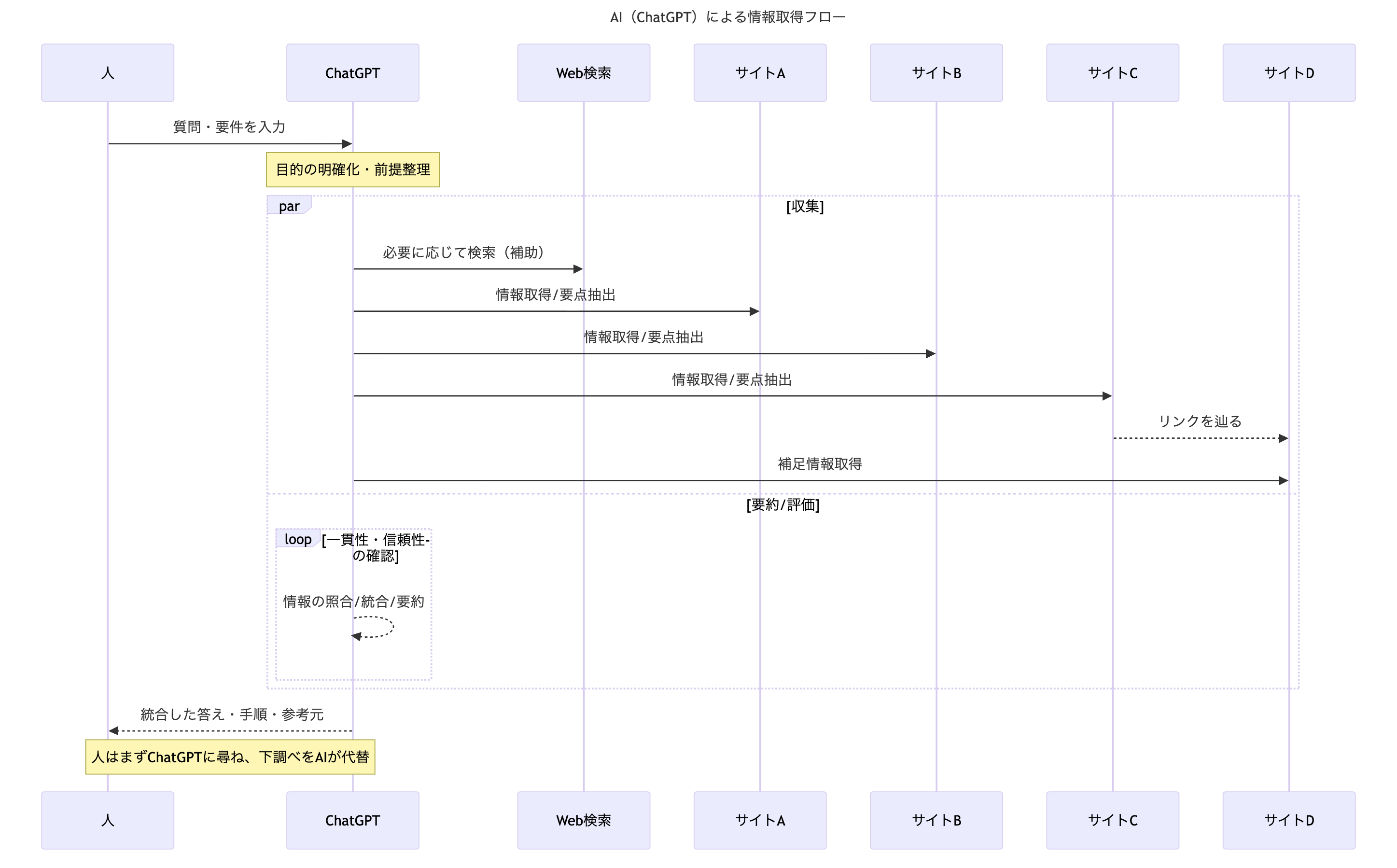 旧来の情報習得では、検索結果からサイトAの記事を選んで読み、解決策が見つからなければ、また検索してサイトBの記事を読む……ということを、人が繰り返していました。しかし、ChatGPTは検索した結果から、サイトAとBとCと……の記事の要点抽出や、補足情報の取得といった一連の流れを統合して人に提示してくれます。