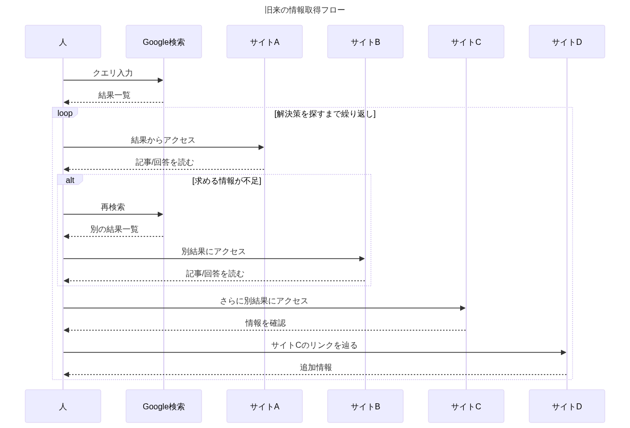 図にするとこんな感じでしょうか。開発者がGoogle検索で検索し、その結果からサイトにアクセスするということを、解決策にたどり着くまで繰り返しているわけです。